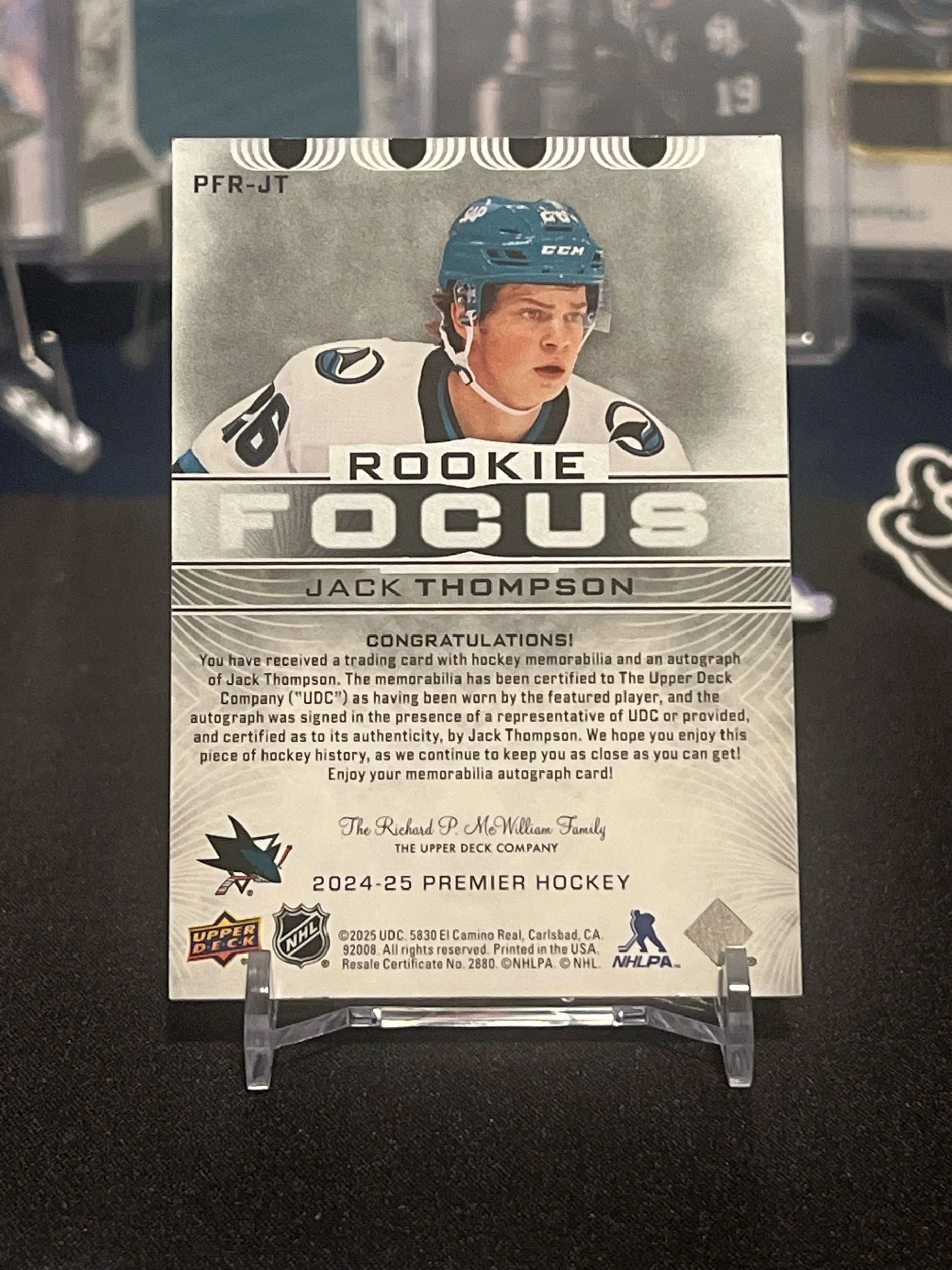 This Jack Thompson Rookie Focus Patch Auto from 2024-25 Upper Deck Premier delivers the full collector package — hard-signed autograph, premium patch memorabilia, and a limited print run of just 99 copies. Built on Upper Deck’s signature Premier stock, the card features a clean layered design with a sharp multi-color Sharks patch window and bold on-card signature that jumps right off the surface.
